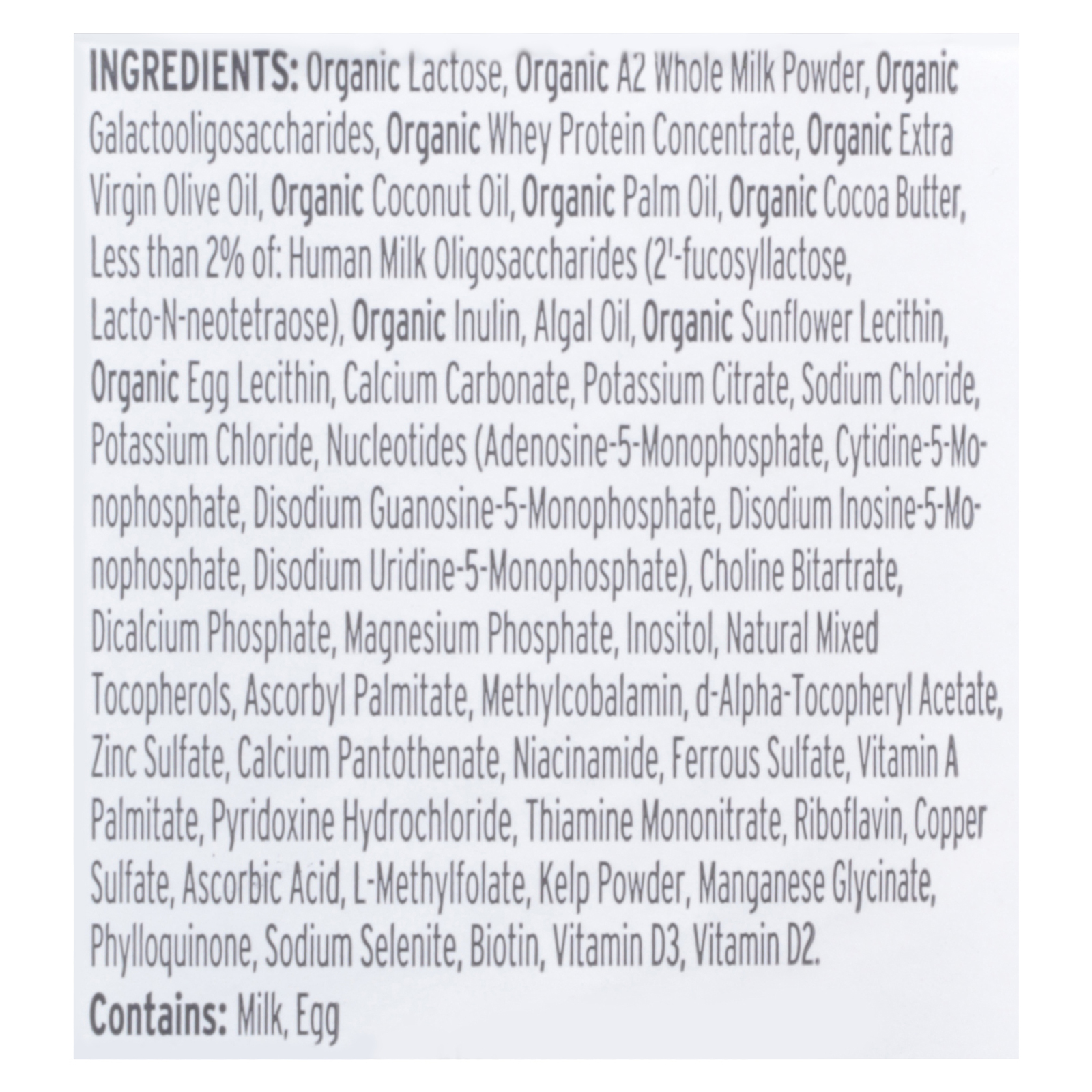 ingredients : organic lactose;organic a2 whole milk powder;organic galactooligosaccharides;organic whey protein concentrate;organic extra virgin olive oil;organic coconut oil;organic palm oil;organic cocoa butter;less than 2% of: human milk oligosaccharides (2′-fucosyllactose, lacto-n-neotetraose), organic inulin, algal oil, organic sunflower lecithin, organic egg lecithin, calcium carbonate, potassium citrate, sodium chloride, potassium chloride, nucleotides (adenosine-5-monophosphate, cytidine-5-monophospha