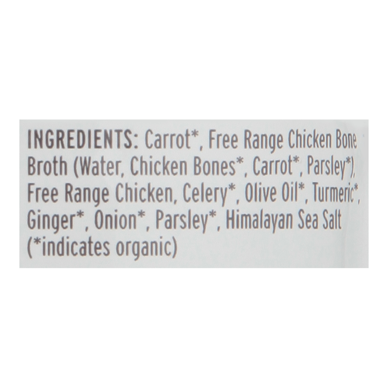 ingredients : carrot;free range chicken bone broth (water, chicken bones*, carrot*, parsley*);free range chicken;celery;olive oil;turmeric;ginger;onion;parsley;himalayan sea salt