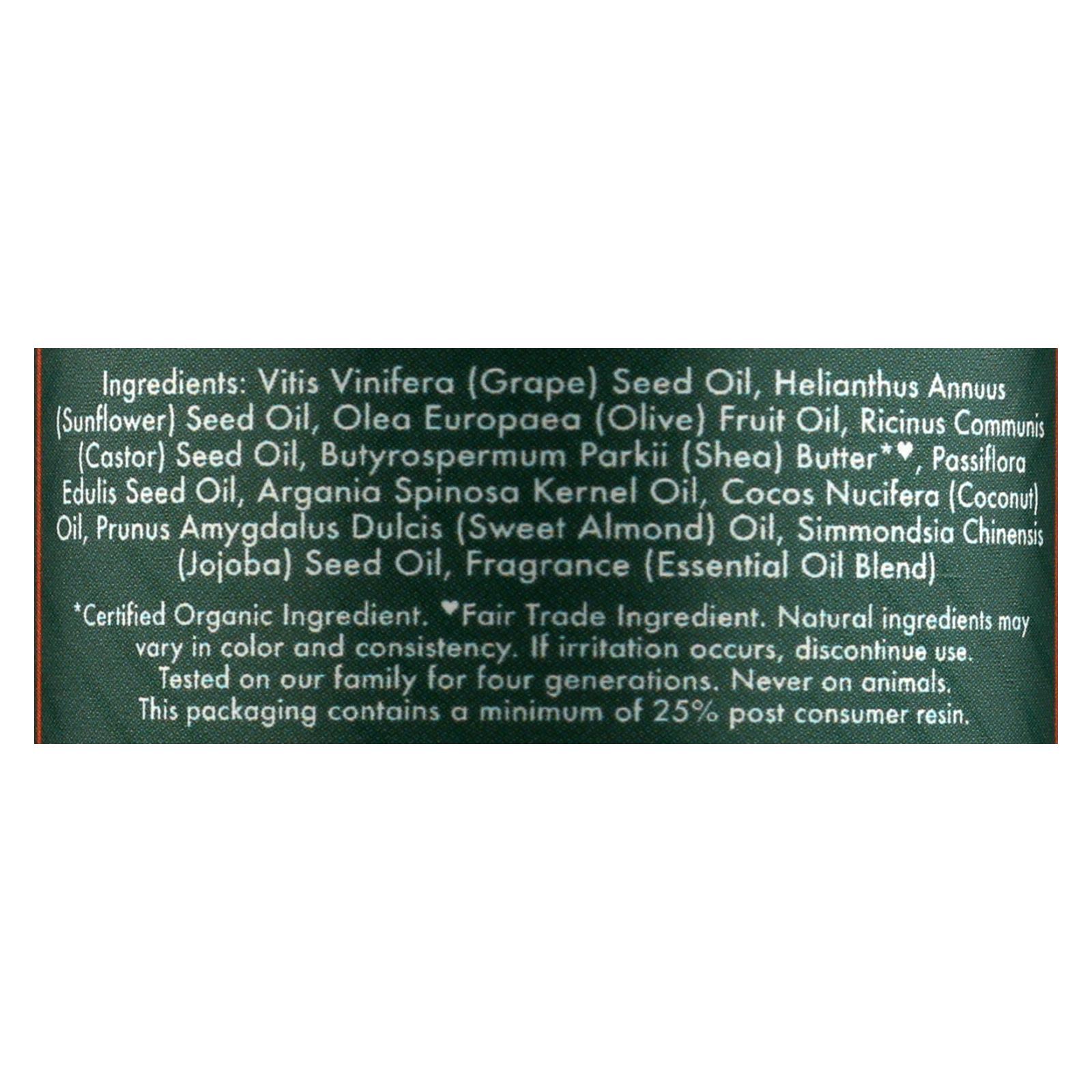 ingredients : vitis vinifera;grape;seed oil;helianthus annuus;sunflower;olea europaea;olive;fruit oil;ricinus communis;castor;butyrospermum parkii;shea;butter*♥;passiflora edulis seed oil;argania spinosa kernel oil;cocos nucifera;coconut;oil;prunus amygdalus dulcis;sweet almond;simmondsia chinensis;jojoba;fragrance;essential oil blend