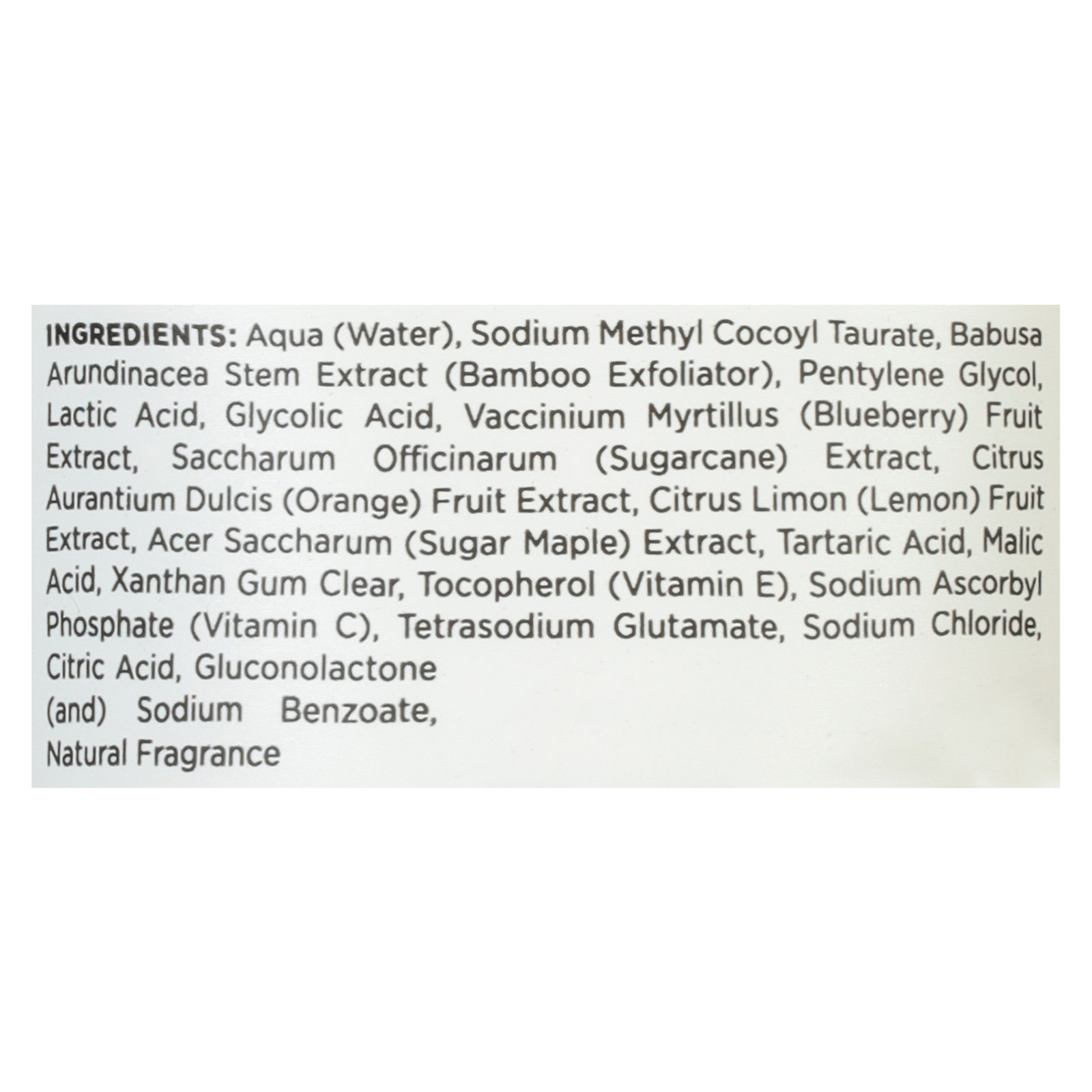 ingredients : aqua (water);sodium methyl cocoyl taurate;babusa arundinacea stem extract (bamboo exfoliator);pentylene glycol;lactic acid;glycolic acid;vaccinium myrtillus (blueberry) fruit extract;saccharum officinarum (sugarcane) extract;citrus aurantium dulcis (orange) fruit extract;citrus limon (lemon) fruit extract;acer saccharum (sugar maple) extract;tartaric acid;malic acid;xanthan gum clear;tocopherol (vitamin e);sodium ascorbyl phosphate (vitamin c);tetrasodium glutamate;sodium chloride;citric acid;gl