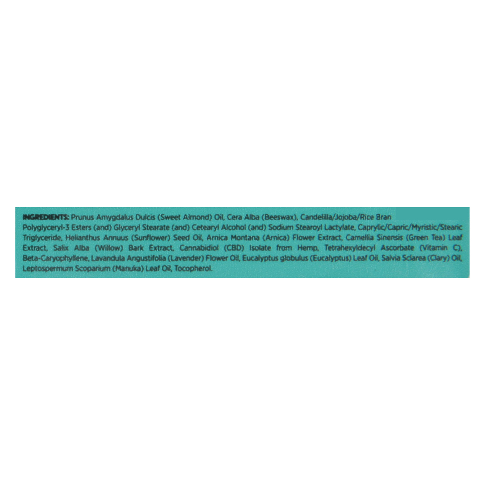 ingredients : prunus amygdalus dulcis (sweet almond) oil;cera alba (beeswax);candelilla/jojoba/rice bran polyglyceryl-3 esters (and) glyceryl stearate (and) cetearyl alcohol (and) sodium stearoyl lactylate;caprylic/capric/myristic/stearic triglyceride;helianthus annuus (sunflower) seed oil;arnica montana (arnica) flower extract;camellia sinensis (green tea) leaf extract;salix alba (willow) bark extract;cannabidiol (cbd) isolate from hemp;tetrahexyldecyl ascorbate (vitamin c);beta-caryophyllene;lavandula angus