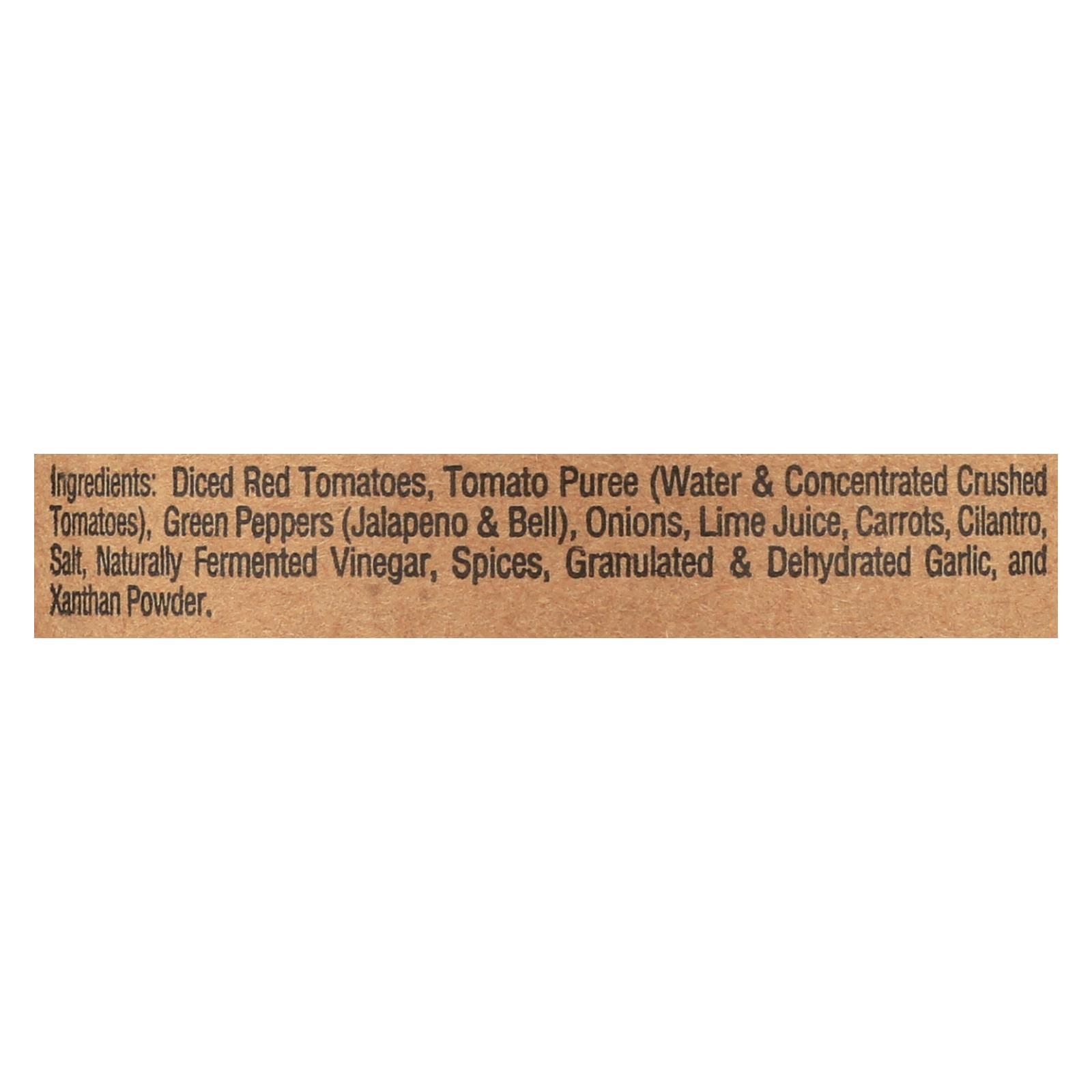 ingredients : diced red tomatoes;tomato puree (water & concentrated crushed tomatoes);green peppers (jalapeno & bell);onions;lime juice;carrots;cilantro;salt;naturally fermented vinegar;spices;granulated & dehydrated garlic;and xanthan powder