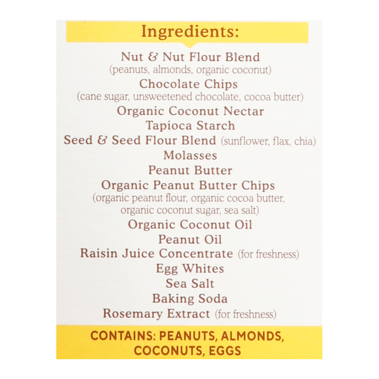 ingredients : nut & nut flour blend (peanuts, almonds, organic coconut) chocolate chips (cane sugar, unsweetened chocolate, cocoa butter) organic coconut nectar tapioca starch seed & seed flour blend (sunflower, flax, chia) molasses peanut butter organic peanut butter chips (organic peanut flour, organic cocoa butter, organic coconut sugar, sea salt) organic coconut oil peanut oil raisin juice concentrate (for freshness) egg whites sea salt baking soda rosemary extract (for freshness)