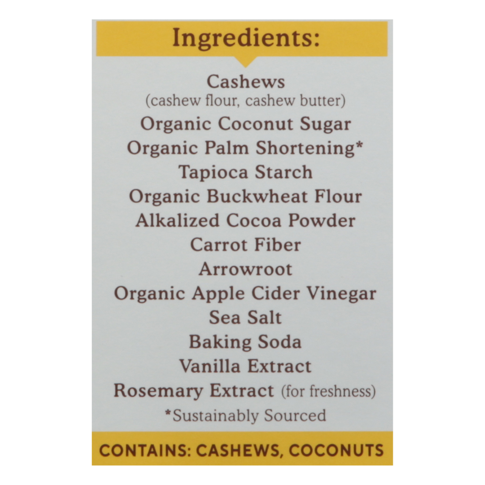 ingredients : cashews (cashew flour, cashew butter) organic coconut sugar organic palm shortening* tapioca starch organic buckwheat flour alkalized cocoa powder carrot fiber arrowroot organic apple cider vinegar sea salt baking soda vanilla extract rosemary extract (for freshness)