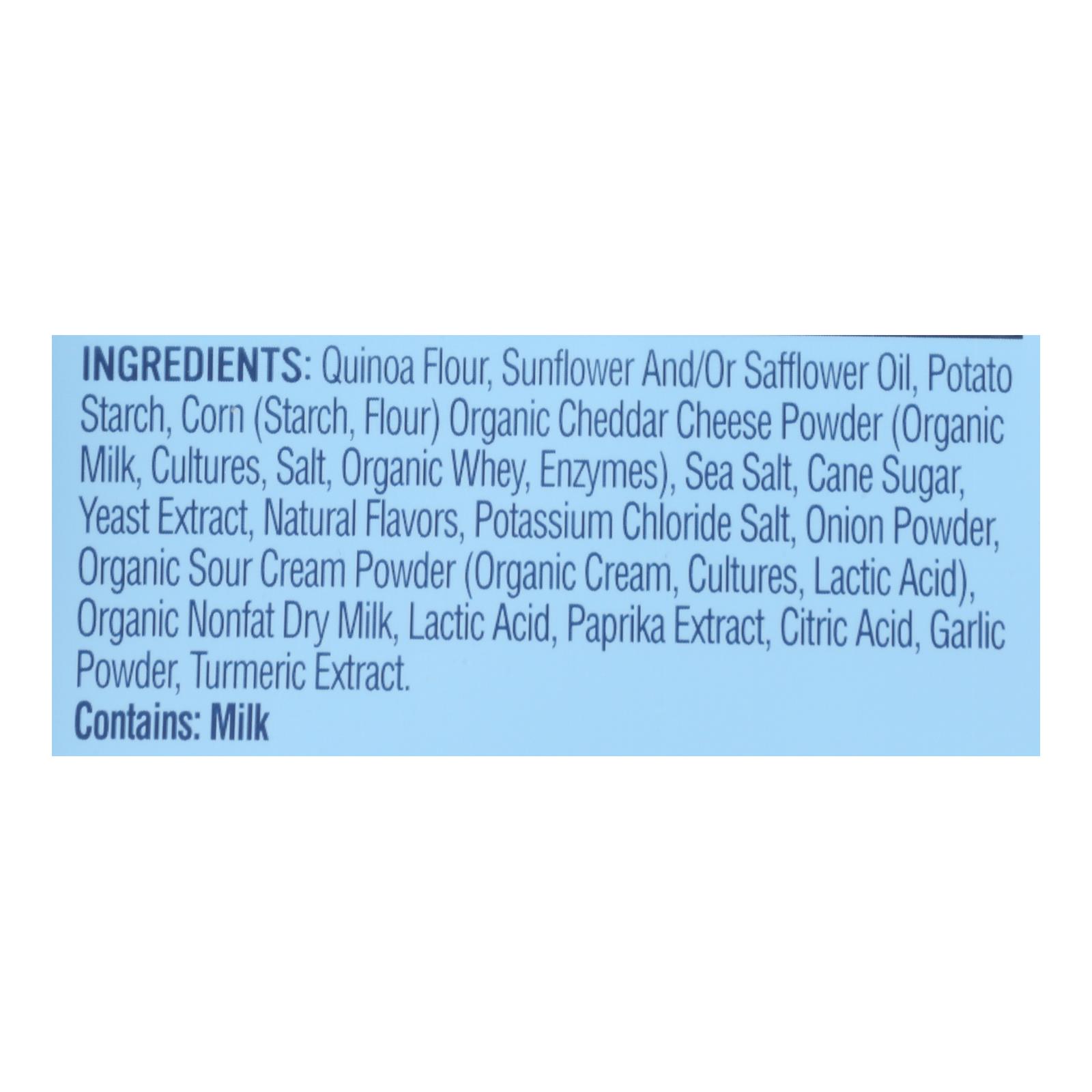 ingredients : quinoa flour;sunflower and/or safflower oil;potato starch;corn;starch;flour;organic cheddar cheese powder;organic milk;cultures;salt;organic whey;enzymes;sea salt;cane sugar;yeast extract;natural flavors;potassium chloride salt;onion powder;organic sour cream powder;organic cream;lactic acid;organic nonfat dry milk;paprika extract;citric acid;garlic powder;turmeric extract