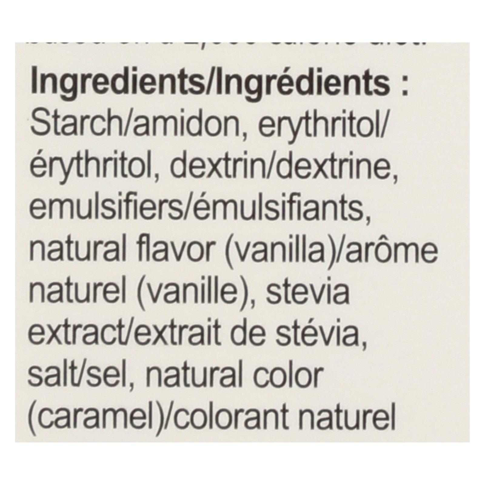 ingredients : starch;erythritol;plant-based soluble fiber;emulsifiers;stevia extract;natural flavor (vanilla);salt;natural color (beta carotene)