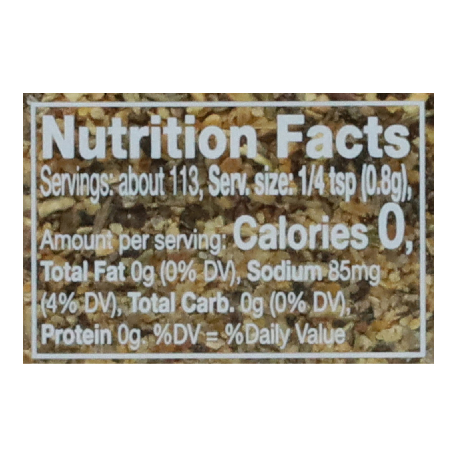 Simply organic lemon pepper is a 100% usda- and qai-certified organic food product. This organic lemon pepper seasoning comes in one 3.17 oz. Glass bottle and has 0 g. Of fat. Additionally, it has no calories, 0 g. Of carbohydrates and 85 mg. Of sodium per serving. This lemon pepper is certified kosher-parve.