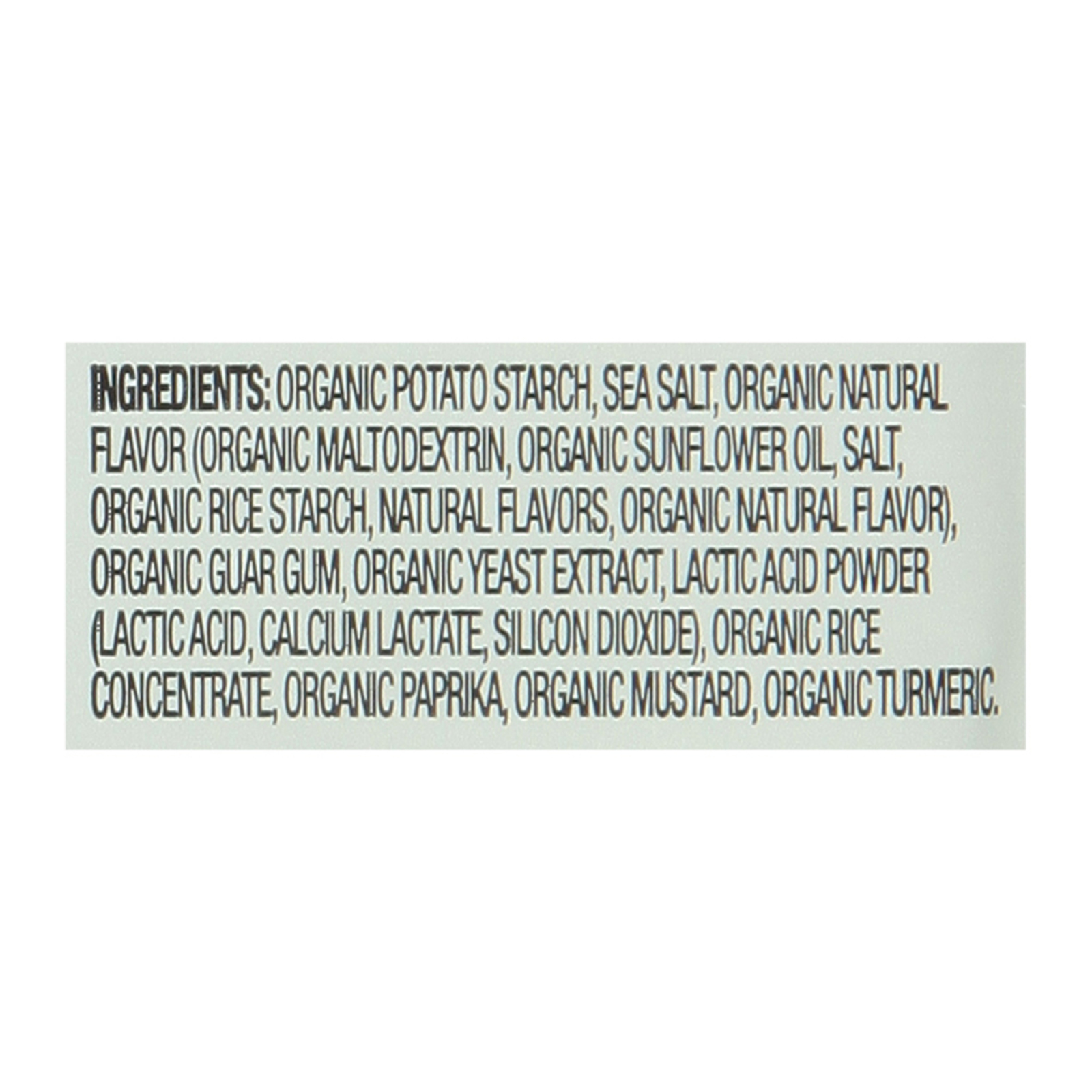 ingredients : organic potato starch;sea salt;organic natural flavor (organic maltodextrin, organic sunflower oil, salt, organic rice starch, natural flavors, organic natural flavor);organic guar gum;organic yeast extract;lactic acid powder (lactic acid, calcium lactate, silicon dioxide);organic rice concentrate;organic paprika;organic mustard;organic turmeric