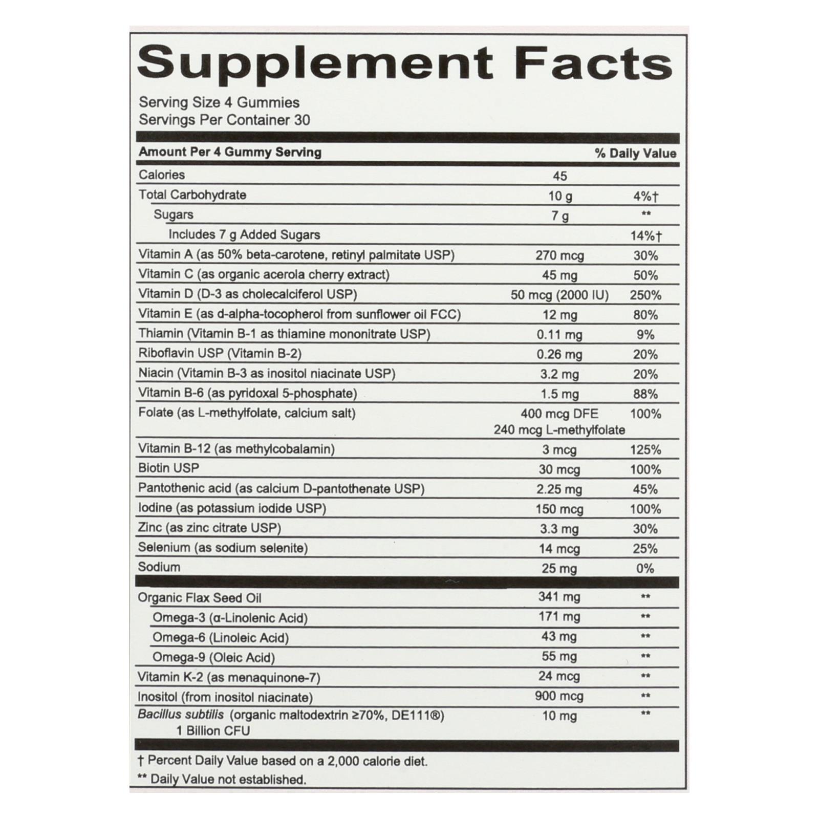 ingredients : vegetarian omega 3s probiotic* bacillus subtilis vitamin d as d3 folate as methylfolate vitamin 812 as methylcobalamin biotin vitamin k as k2 zinc