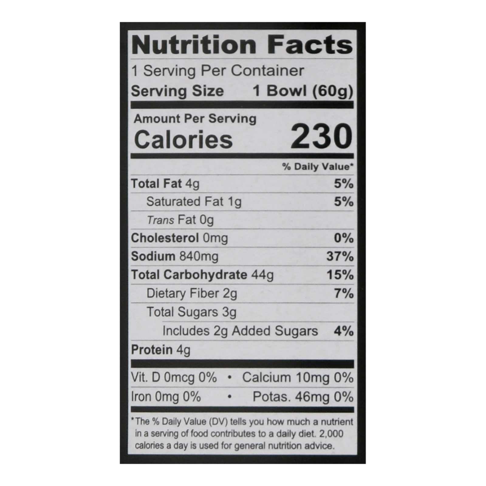 ingredients : rice noodles: rice, tapioca starch, sugar, salt, and cellulose gum;soup base: salt, sugar, yeast extract, onion* and spices*, disodium guanylate and disodium inosinate, silicon dioxide, caramel color and citric acid;flavoring oil: soybean oil, spices and garlic extract, artificial chicken flavor (sunflower oil, triglyceride, flavorings), spices* and turmeric, and oleoresin paprika;vegetable pack: carrot*, spring onion*, and onion