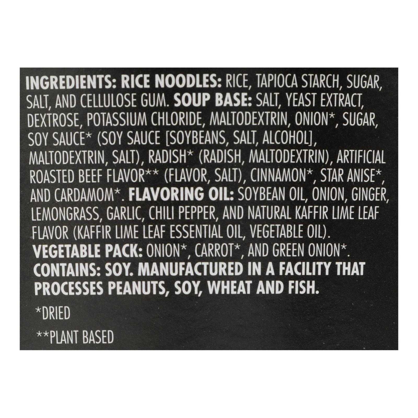 ingredients : rice noodles: rice, tapioca starch, sugar, salt, and cellulose gum;soup base: salt, yeast extract, dextrose, potassium chloride, maltodextrin, onion*, sugar, soy sauce* (soy sauce [soybeans, salt, alcohol], maltodextrin, salt), radish* (radish, maltodextrin), artificial roasted beef flavor** (flavor, salt), cinnamon*, star anise*, and cardamom;flavoring oil: soybean oil, onion, ginger, lemongrass, garlic, chili pepper, and natural kaffir lime leaf flavor (kaffir lime leaf essential oil, vegetabl
