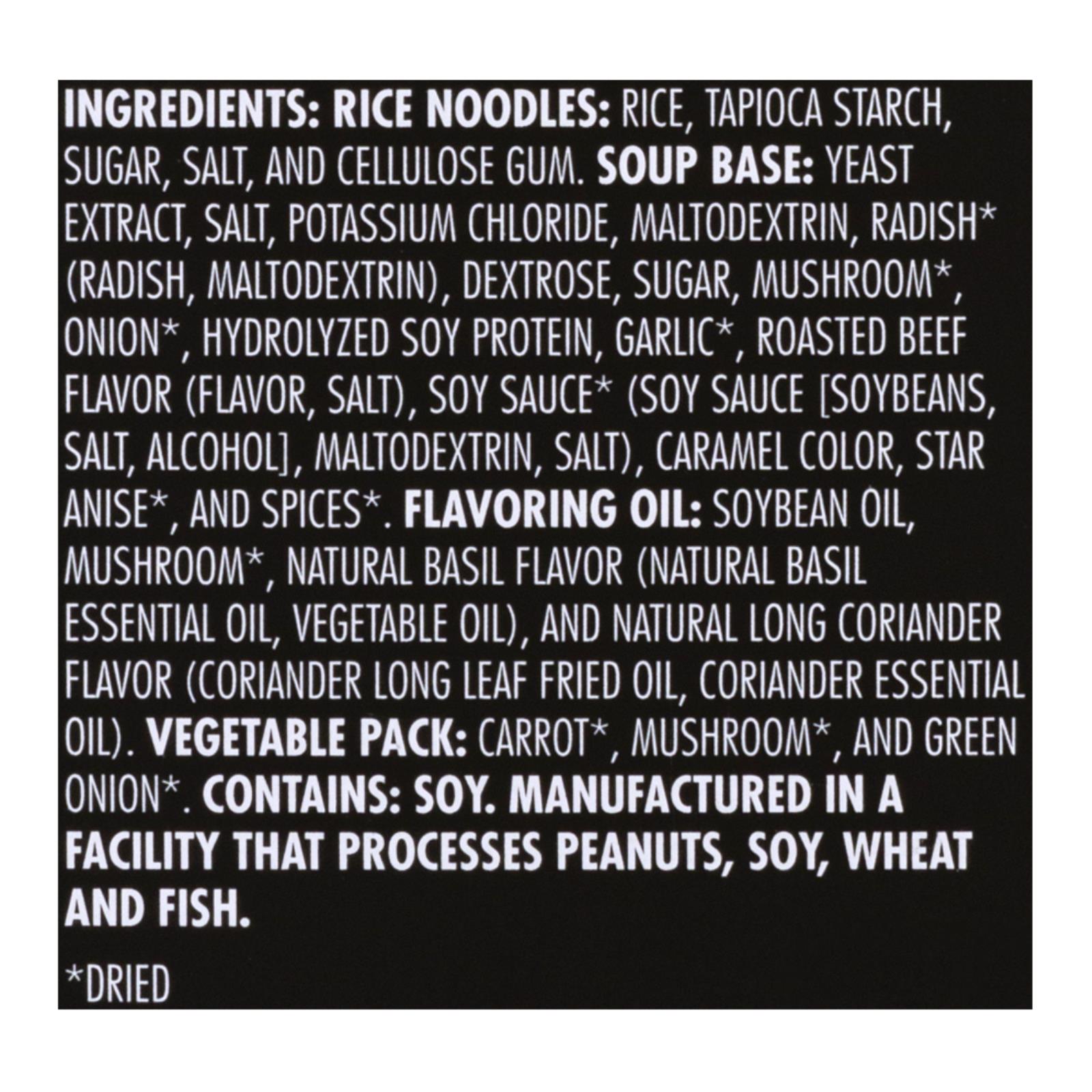ingredients : rice noodles: rice, tapioca starch, sugar, salt, and cellulose gum;soup base: yeast extract, salt, potassium chloride, maltodextrin, radish* (radish, maltodextrin), dextrose, sugar, mushroom*, onion*, hydrolyzed soy protein, garlic*, artificial roasted beef flavor** (flavor, salt), soy sauce* (soy sauce [soybeans, salt, alcohol], maltodextrin, salt), caramel color, star anise*, and spices;flavoring oil: soybean oil, mushroom*, natural basil flavor (natural basil essential oil, vegetable oil), an