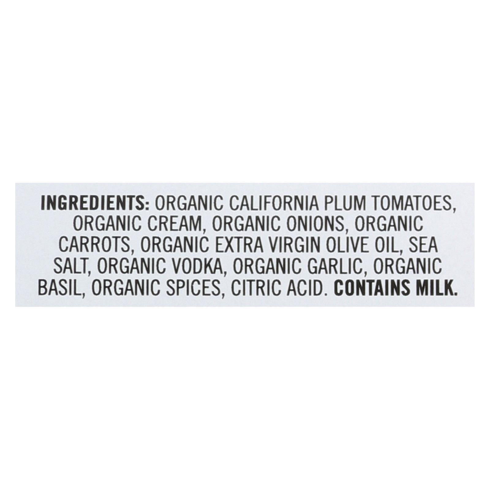 ingredients : organic california plum tomatoes;organic cream;organic onions;organic carrots;organic extra virgin olive oil;sea salt;organic vodka;organic garlic;organic basil;organic spices;citric acid