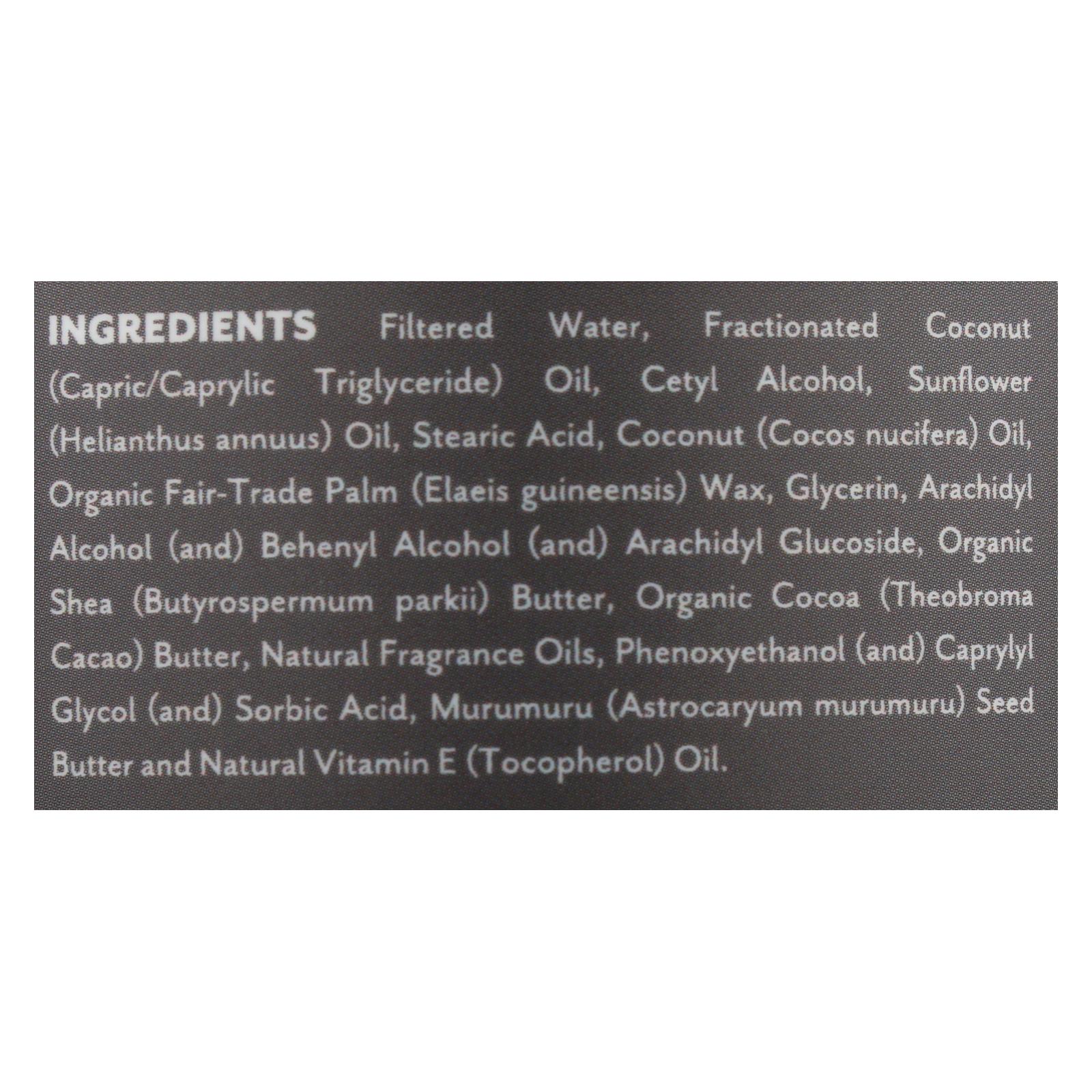 ingredients : filtered water;fractionated coconut;capric/ caprylic triglyceride;oil;cetyl alcohol;sunflower;helianthus annuus;stearic acid;coconut;cocos nucifera;organic fair-trade palm;elaeis guineensis;wax;glycerin;arachidyl alcohol;and;behenyl alcohol;arachidyl glucoside;organic shea;butyrospermum parkii;butter;organic cocoa;theobroma cacao;natural fragrance oils;phenoxyethanol;caprylyl glycol;sorbic acid;murumuru;astrocaryum murumuru;seed butter and natural vitamin e;tocopherol