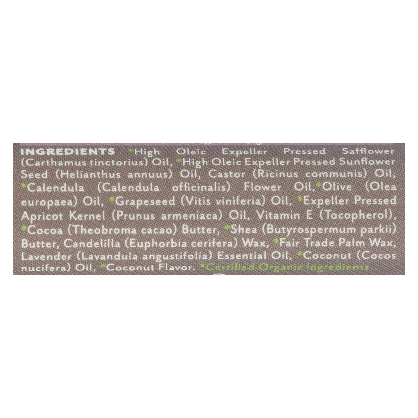 ingredients : high oleic expeller pressed safflower;carthamus tinctorius;oil;high oleic expeller pressed sunflower seed;helianthus annuus;castor;ricinus communis;calendula;calendula officinalis;flower oil;olive;olea europaea;grapeseed;vitis viniferia;expeller pressed apricot kernel;prunus armeniaca;vitamin e;tocopherol;cocoa;theobroma cacao;butter;shea;butyrospermum parkii;candelilla;euphorbia cerifera;wax;fair trade palm wax;lavender;lavandula angustifolia;essential oil;coconut;cocos nucifera;coconut flavor