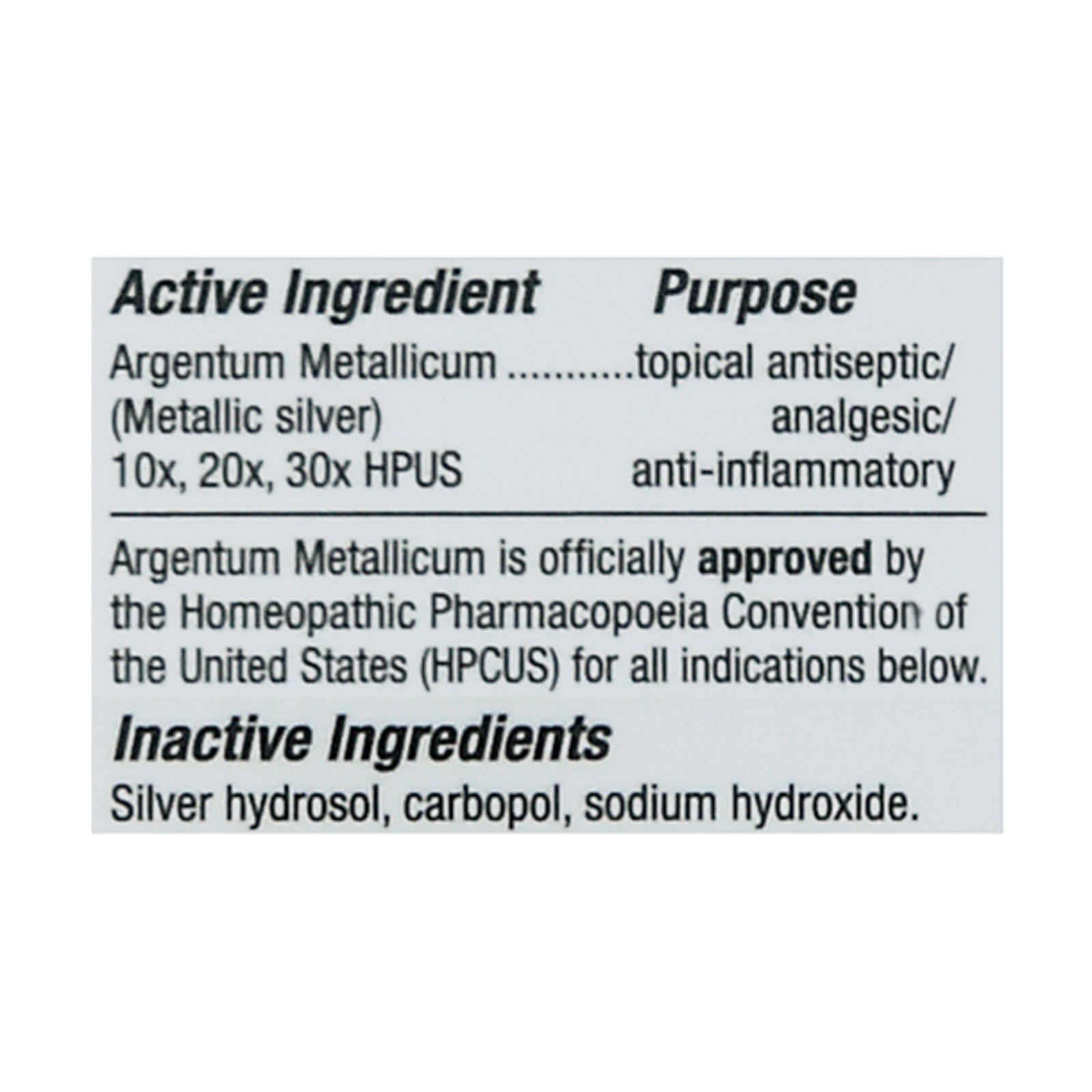 ingredients : argentum metallicum (metallic silver) 10x;20x;30x hpus purpose topical antiseptic/ analgesic/ anti-inflammatory;silver hydrosol;carbopol;sodium hydroxide