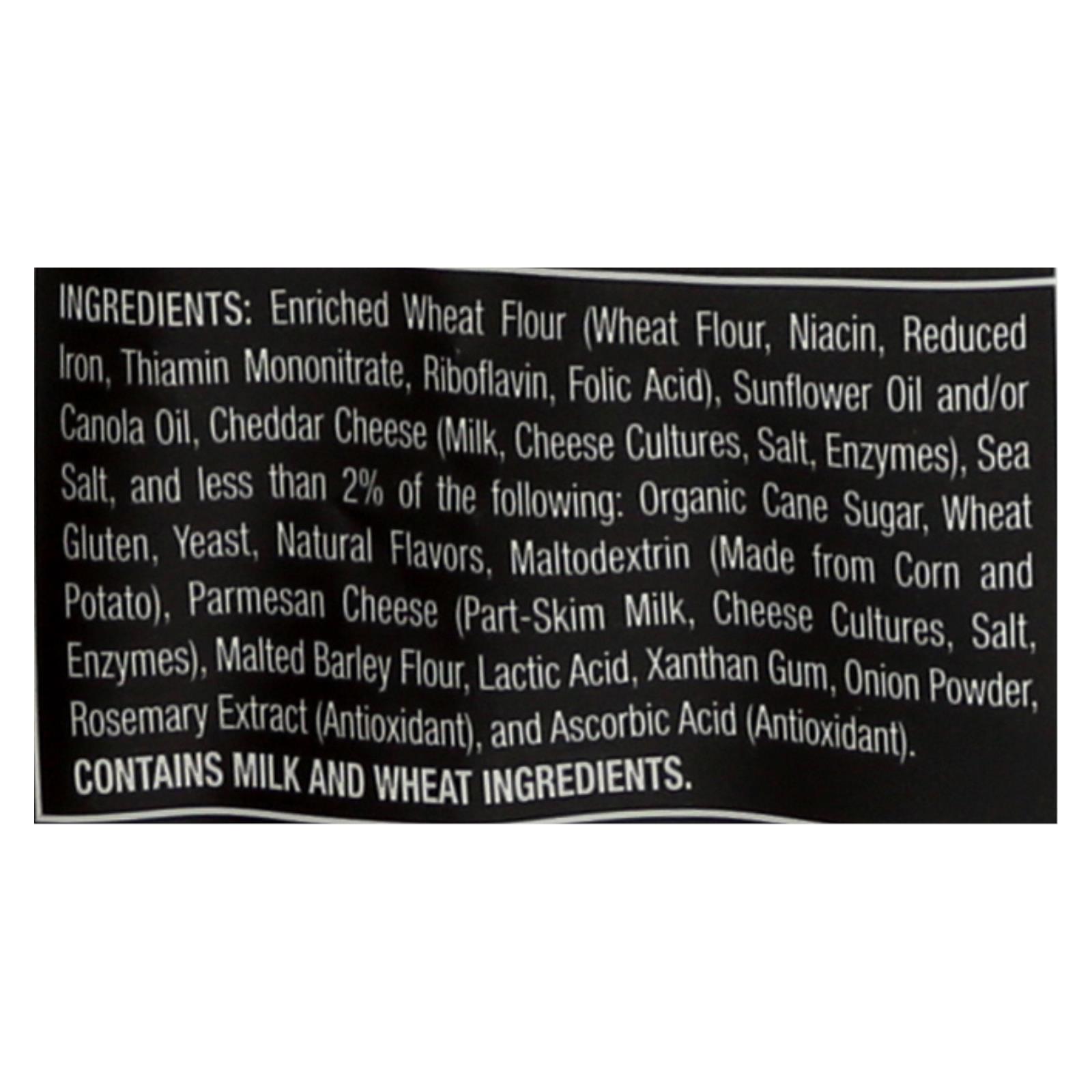 ingredients : enriched wheat flour;wheat flour;niacin;reduced iron;thiamin mononitrate;riboflavin;folic acid;sunflower and/or canola oil;cheddar cheese;milk;cheese cultures;salt;enzymes;sea salt;less than 2% of the following: organic cane sugar;wheat gluten;yeast;natural flavors;maltodextrin;made from corn and potato;parmesan cheese;part-skim milk;malted barley flour;lactic acid;xanthan gum;onion powder;rosemary extract;antioxidant;and ascorbic acid
