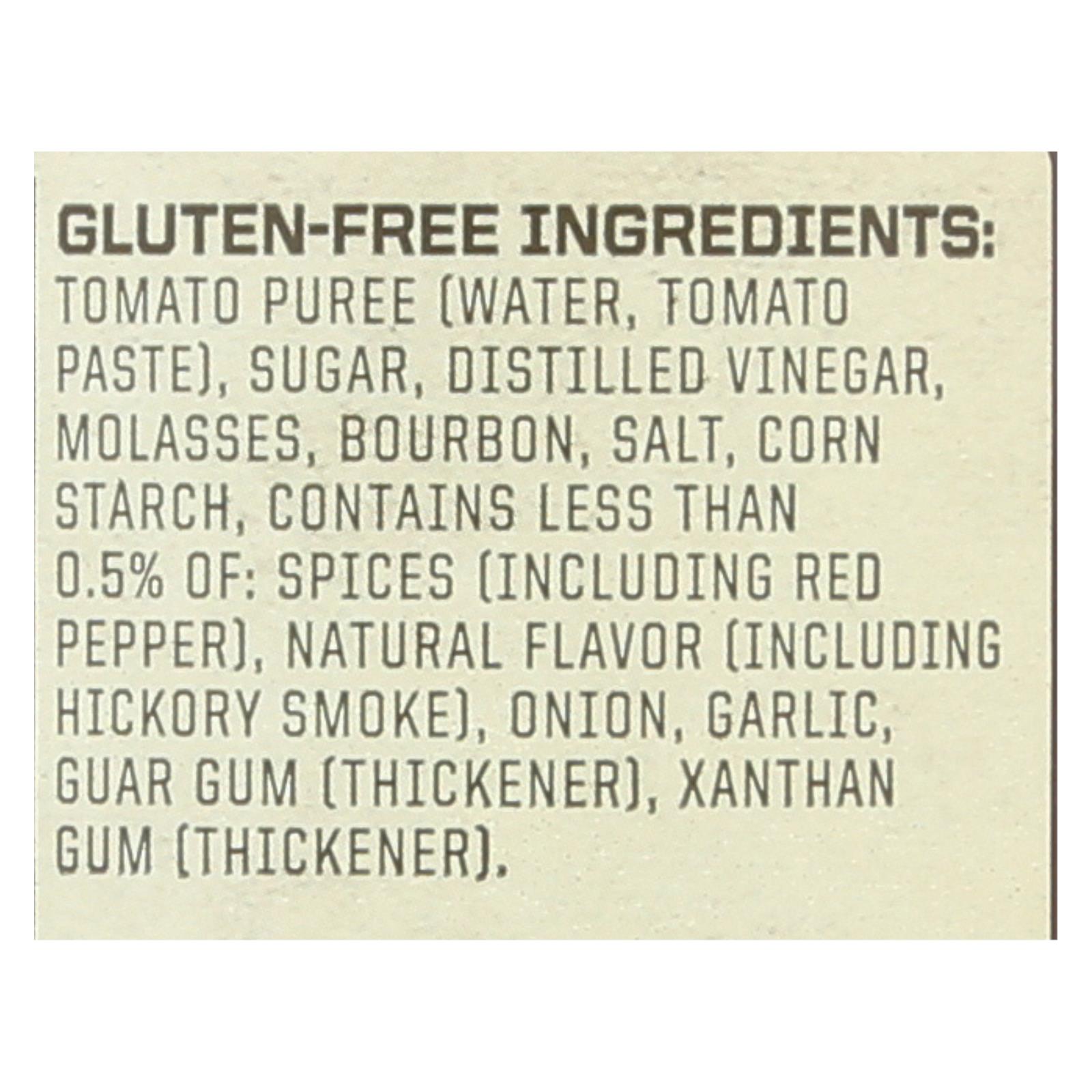 ingredients : gluten-free tomato puree;water;tomato paste;sugar;distilled vinegar;molasses;bourbon;salt;corn starch;contains less than 0.5% of: spices;including red pepper;natural flavor;including hickory smoke;onion;garlic;guar gum;thickener;xanthan gum
