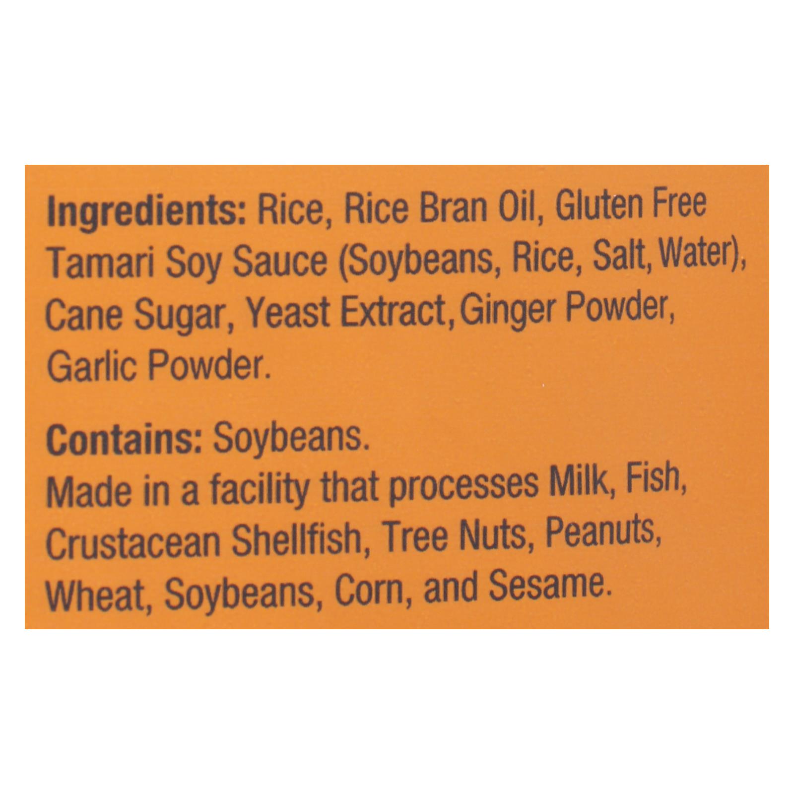 ingredients : rice;rice bran oil;gluten free tamari soy sauce (soybeans, rice, salt, water);cane sugar;yeast extract;ginger powder;garlic powder