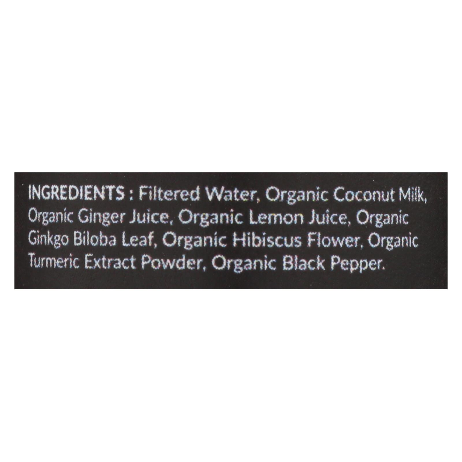 ingredients : filtered water;organic coconut milk;organic ginger juice;organic lemon juice;organic ginkgo biloba leaf;organic hibiscus flower;organic turmeric extract powder;organic black pepper