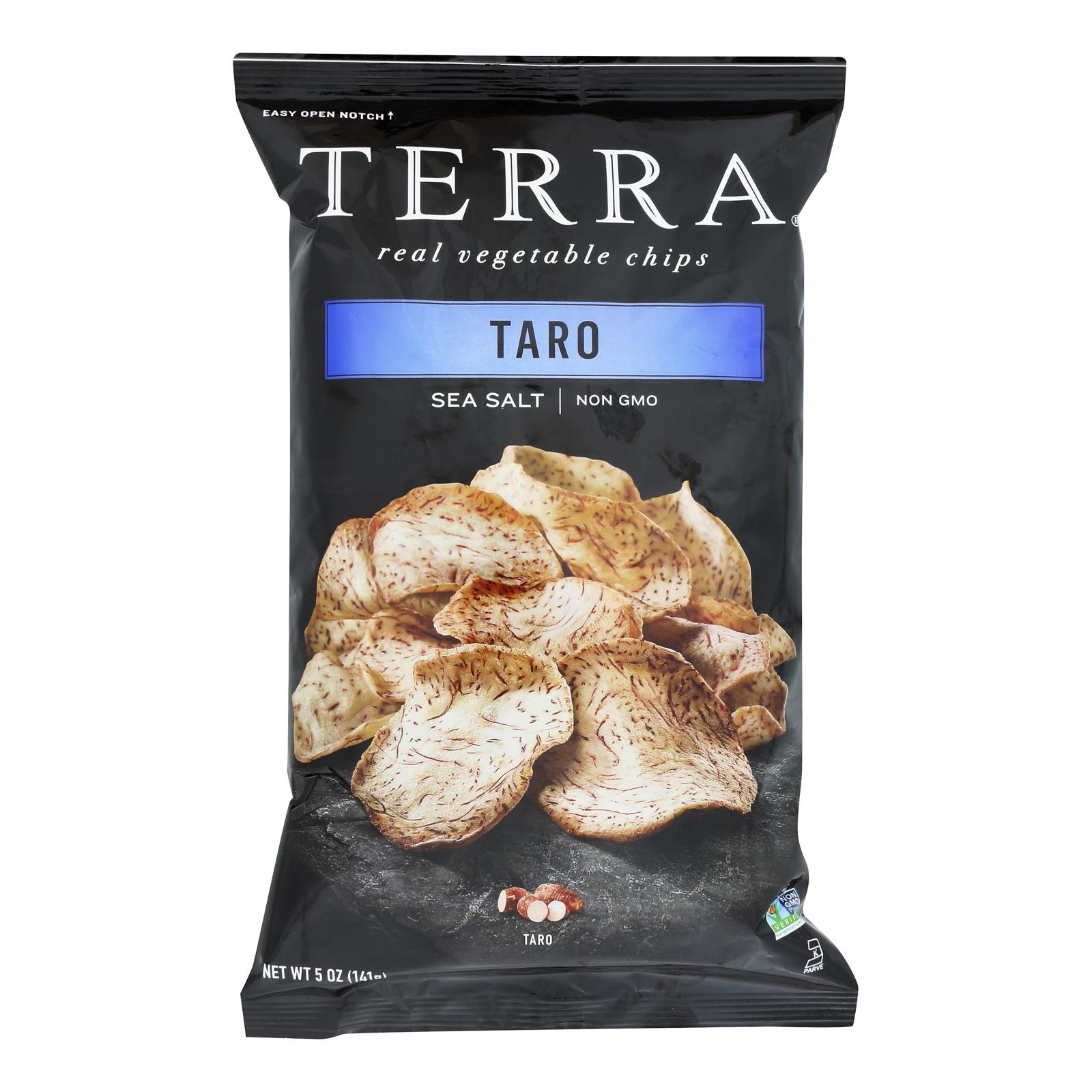Terra chips, taro original sea salt, are a non-gmo, certified kosher-parve and gluten-free snack so people with these dietary restrictions can enjoy it. Every 6 oz., easy-open-notch bag of terra original tarro sea salt chips has 0 g. Of trans fat and cholesterol. Every 10-chip serving provides 2 g. Of dietary fiber and contains just 1 g. Of sugars.