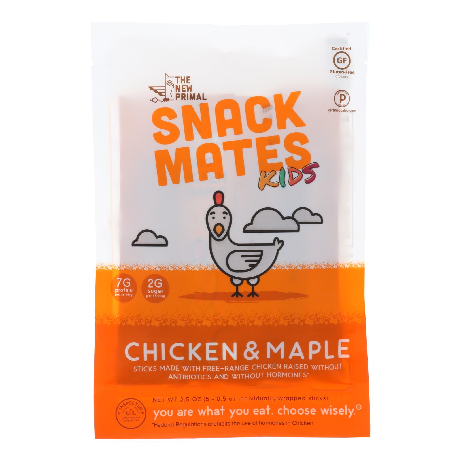 7 g protein per serving. 2 g sugar per serving. Certified gf gluten-free. Gfco.org; certified p paleo: certifiedpaleo.com. Soy-free. Paleo friendly. Individually wrapped sticks. Sticks made with free-range chicken raised without antibiotics and without hormones (federal regulation prohibits the use of hormones in chicken). You are what you eat. Choose wisely. Portable snacks for kids. Free-range chicken used choose wisely. Inspected for wholesomeness by us department of agriculture. Thenewprimal.com.