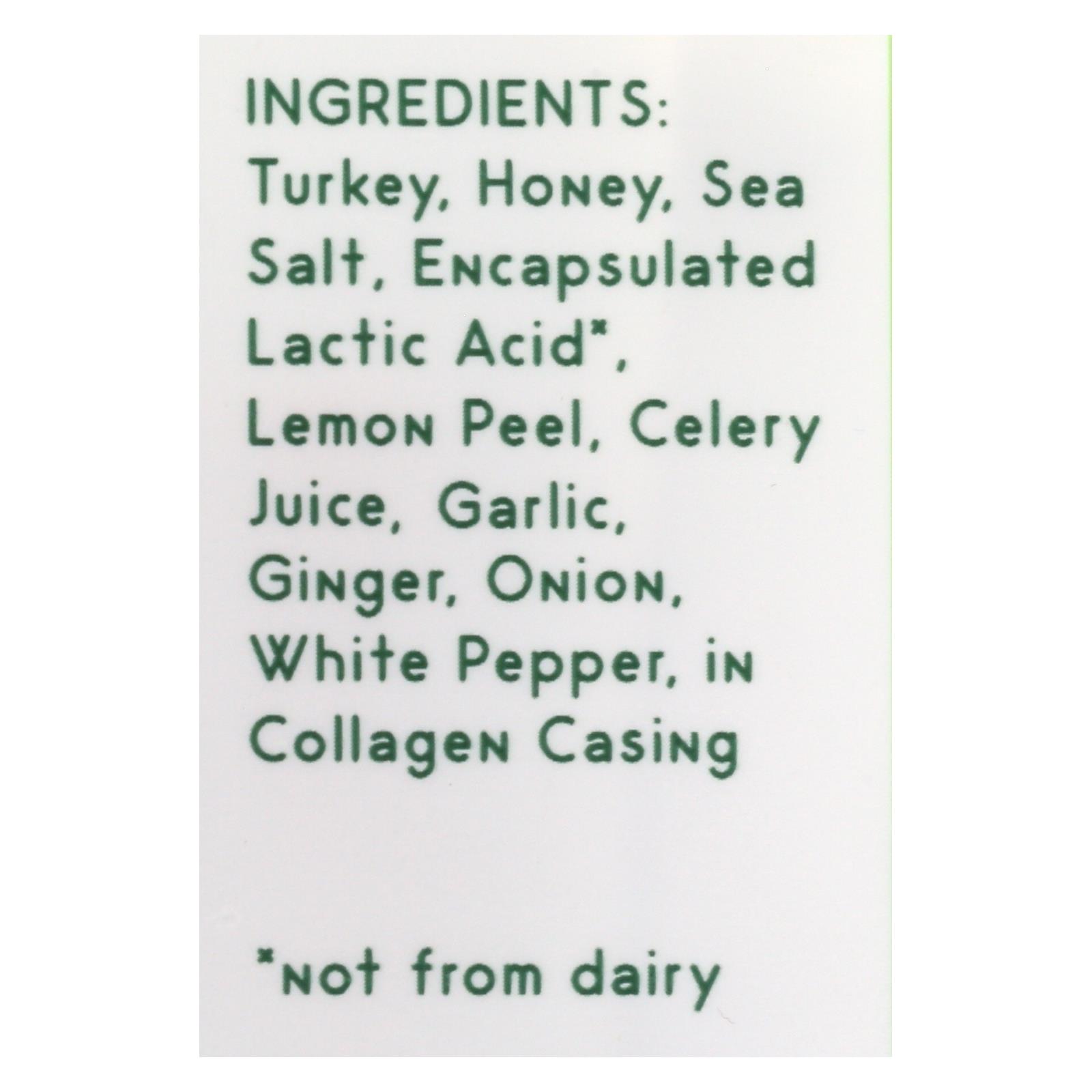 ingredients : turkey;honey;sea salt;encapsulated lactic acid;lemon peel;celery juice;garlic;ginger;onion;white pepper;in collagen casing