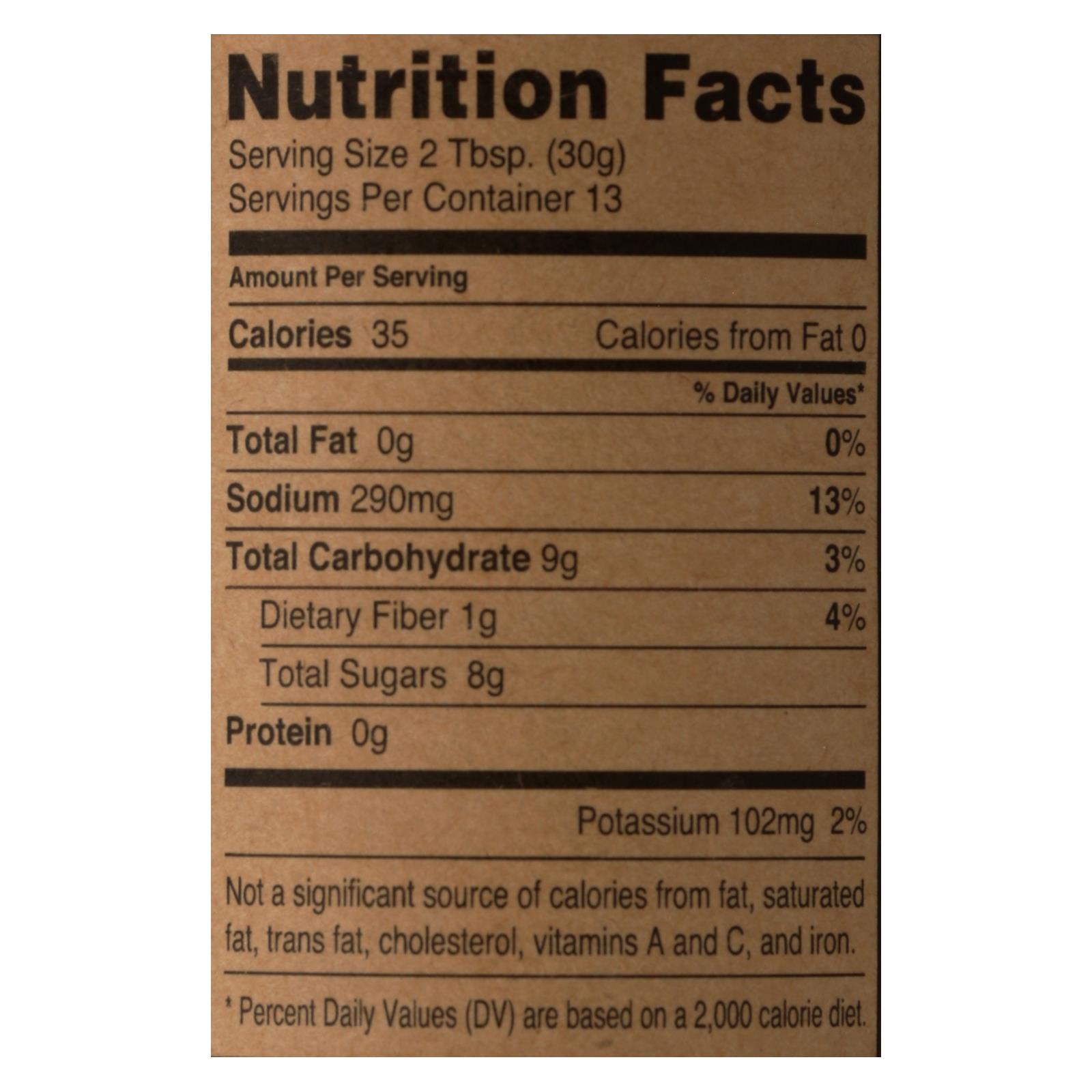 ingredients : tomato puree* (tomato paste, water);cane sugar;tamari* (water, soy beans*, salt, alcohol*);white vinegar;molasses;worcestershire sauce* (apple cider vinegar*, water, tamari* [water, soy beans*, salt], molasses*, cane sugar*, salt, tamarind*, ginger*, lemon juice concentrate*, garlic powder*, onion powder*, xanthan gum, shiitake mushroom powder*, allspice*, red pepper*, orange extract*, ground clove*, natural smoke flavor, lemon extract*);black garlic;hickory liquid smoke (water, natural hickory