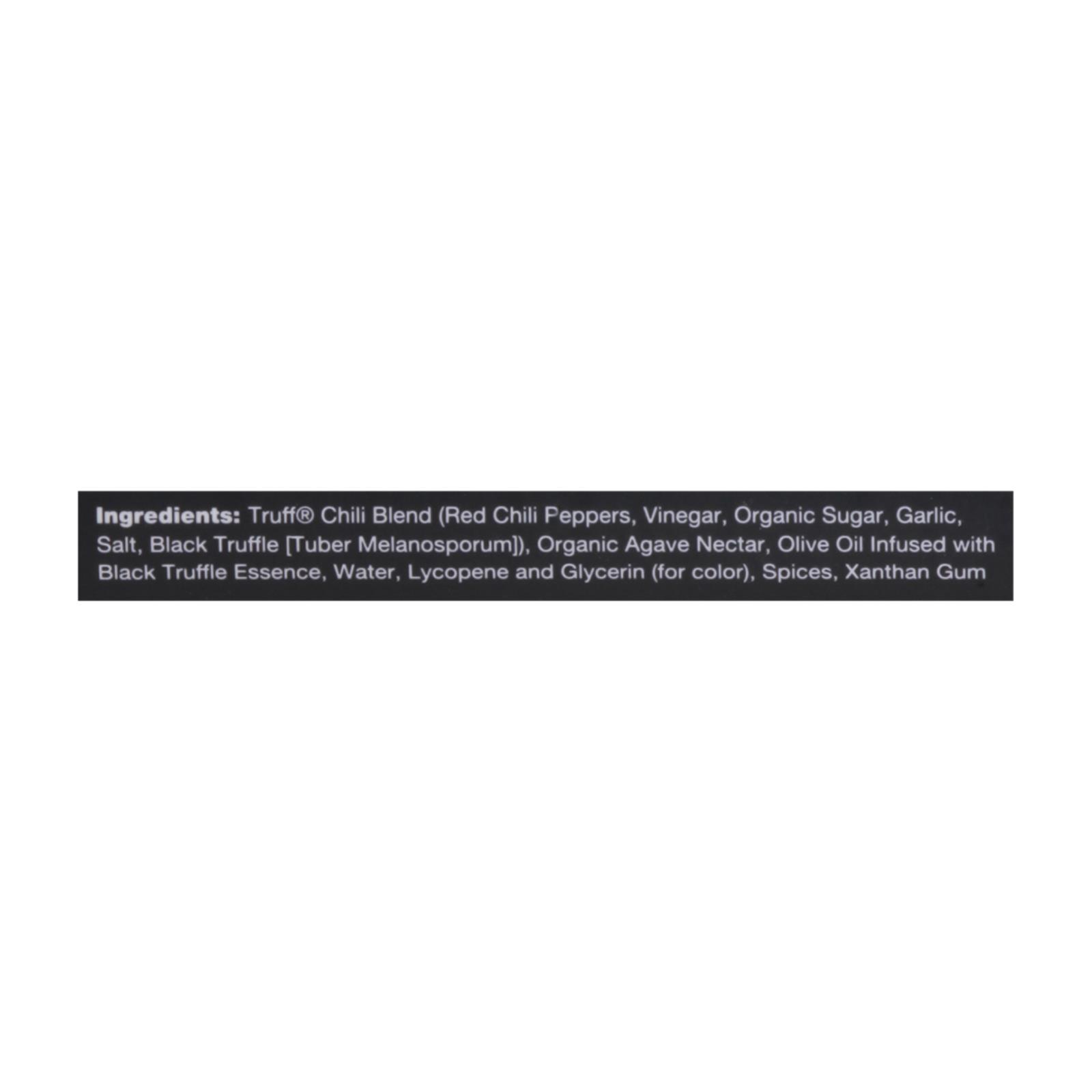 ingredients : truff® chili blend (red chili peppers, vinegar, organic sugar, garlic, salt, black truffle [tuber melanosporum]);organic agave nectar;olive oil infused with black truffle essence;lycopene and glycerin (for color);spices;xanthan gum