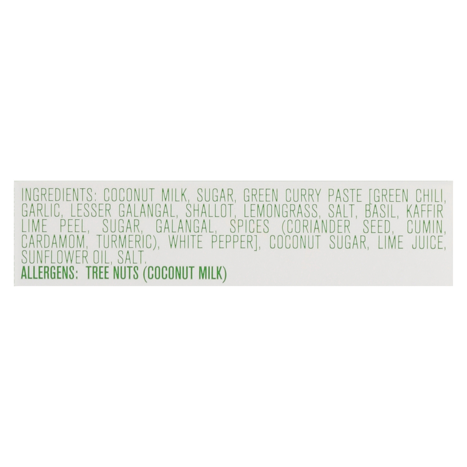 ingredients : coconut milk;sugar;green curry paste [green chili, garlic, lesser galangal, shallot, lemongrass, salt, basil, kaffir lime peel, sugar, galangal, spices (coriander seed, cumin, cardamom, turmeric), white pepper];coconut sugar;lime juice;sunflower oil;salt
