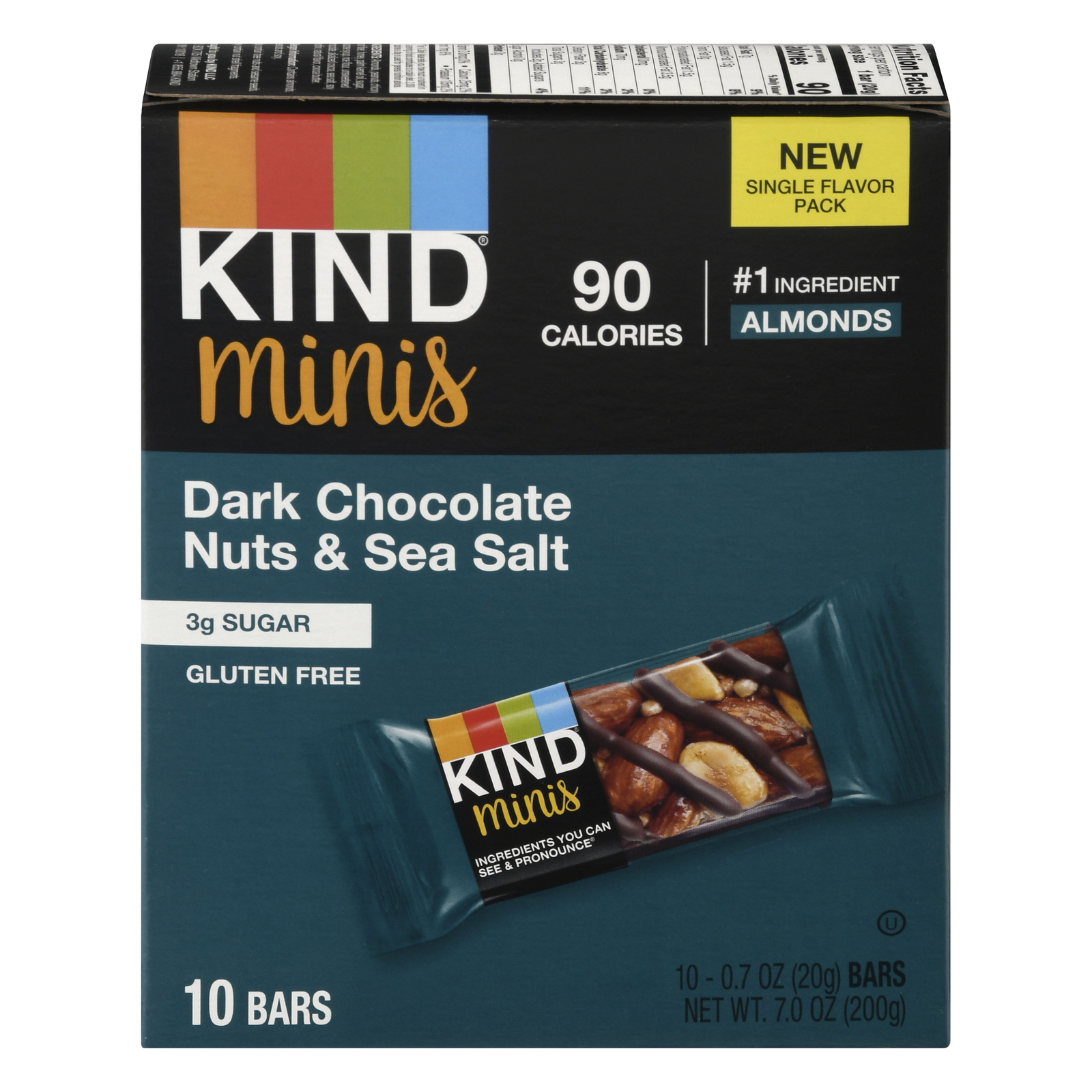 Kind – bar mini dark chocolate nut sea salt – case of 8-10/.7 ozcountry of origin : united states of americais gluten free : yesis gmo free : yesis kosher : yessize : 10/.7 ozpack of : 8selling unit : caseingredients : almonds;peanuts;chicory root fiber;honey;palm kernel oil;sugar;glucose syrup;rice flour;unsweetened chocolate;alkalized cocoa;sea salt;soy lecithin;natural flavor;cocoa butter